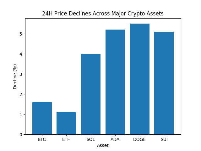 - Altcoins such as Solana, Cardano, Dogecoin, and Sui experienced steeper losses than Bitcoin.