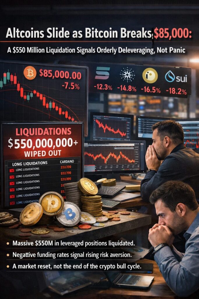 Bitcoin’s drop below $85,000 and the ensuing altcoin sell-off mark a clear shift in short-term market dynamics. However, the absence of panic indicators—such as volume spikes or systemic stress—points toward a controlled reset rather than a breakdown.