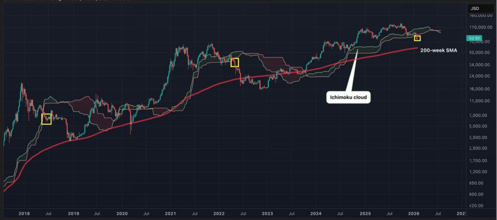 During past cycles — notably 2015, 2018–2019, and 2022 — price consolidation within this cloud preceded major long-term recoveries. The current structure shows Bitcoin attempting to hold above the 200W SMA while repeatedly testing the EMA boundary.