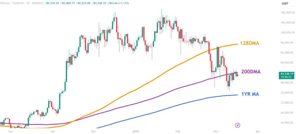 Beyond the EMA, Bitcoin is also interacting with the 200-week simple moving average (200W SMA). Together, these two lines form what traders often describe as a “support cloud.”