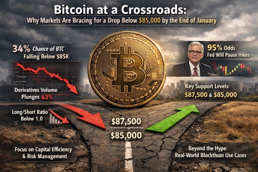 - Prediction markets now assign a 34% probability that Bitcoin will fall below $85,000 by the end of January, reflecting growing macro and geopolitical uncertainty.