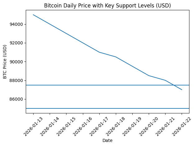 [Bitcoin Daily Chart with Rising Wedge and Support Levels]