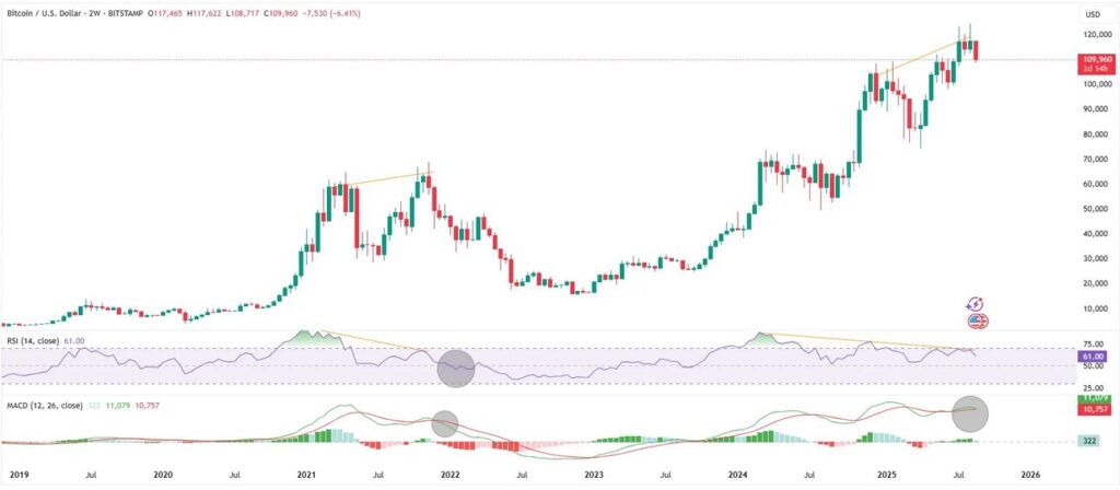 His analysis focuses on higher-timeframe technical indicators, particularly the Relative Strength Index (RSI) on the weekly chart. Pillows compares the current bearish RSI divergence with a similar pattern observed during Bitcoin’s 2021 bull-market peak.