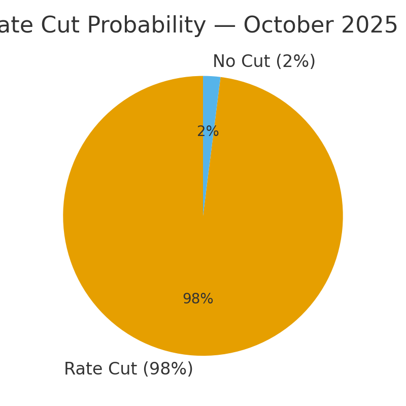 One of the strongest catalysts behind Bitcoin’s recent move is the rising expectation that the Fed will cut interest rates at its upcoming meeting (October 29, 2025). Market pricing now implies over a 98 % probability of a 0.25 % cut.