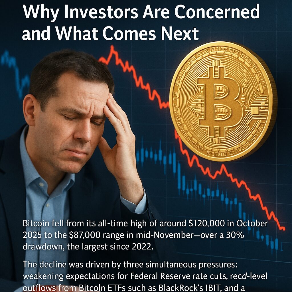 - Bitcoin fell from its all-time high of around $120,000 in October 2025 to the $87,000 range in mid-November—over a 30% drawdown, the largest since 2022.