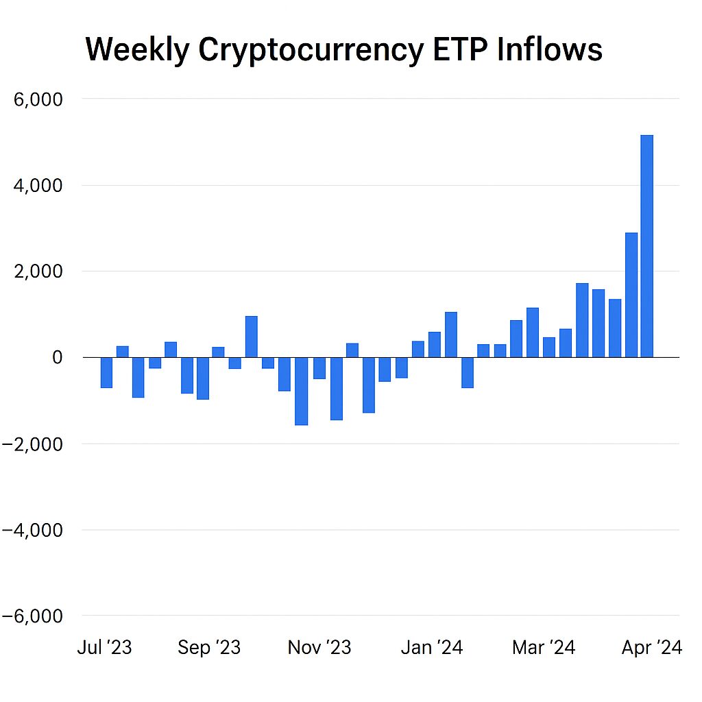 - Global crypto ETPs / ETFs recorded record weekly inflows (≈ $5.6–5.7 billion).