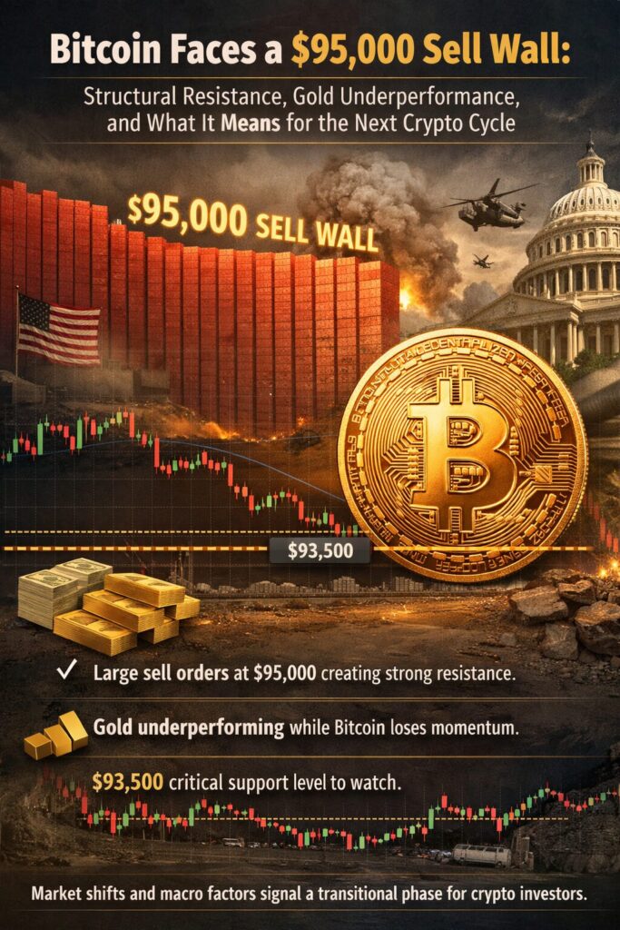This price behavior is not merely psychological. Market participants observed significant sell-side liquidity clustered around $95,000, creating what traders commonly refer to as a “sell wall.” These large resting orders effectively cap upward price movement unless buyers bring sufficient volume to absorb them.