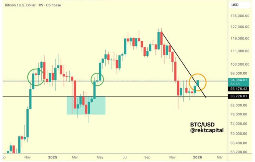 From a medium-term perspective, trader and analyst Rekt Capital introduced a more constructive view. He observed that Bitcoin successfully defended the lower boundary of its weekly range.