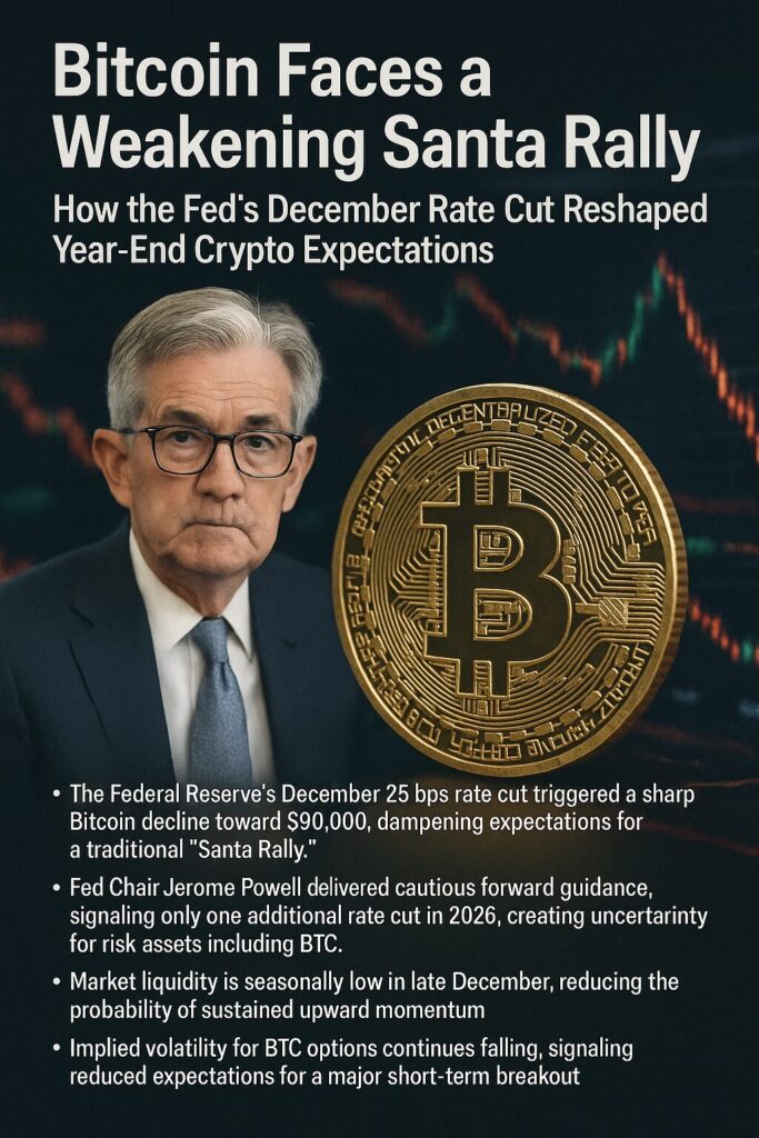 • The Federal Reserve’s December 25 bps rate cut triggered a sharp Bitcoin decline toward $90,000, dampening expectations for a traditional “Santa Rally.”