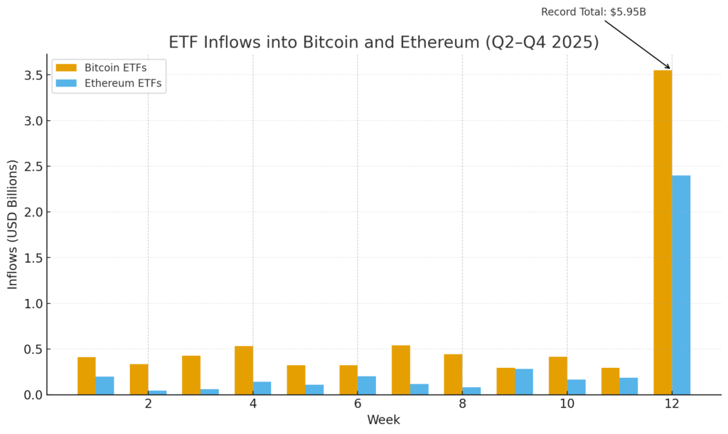 In early October 2025, global crypto ETFs recorded a record $5.95 billion inflow over a single week, with Bitcoin grabbing the lion’s share ($3.55 billion) and Ethereum also drawing significant capital.