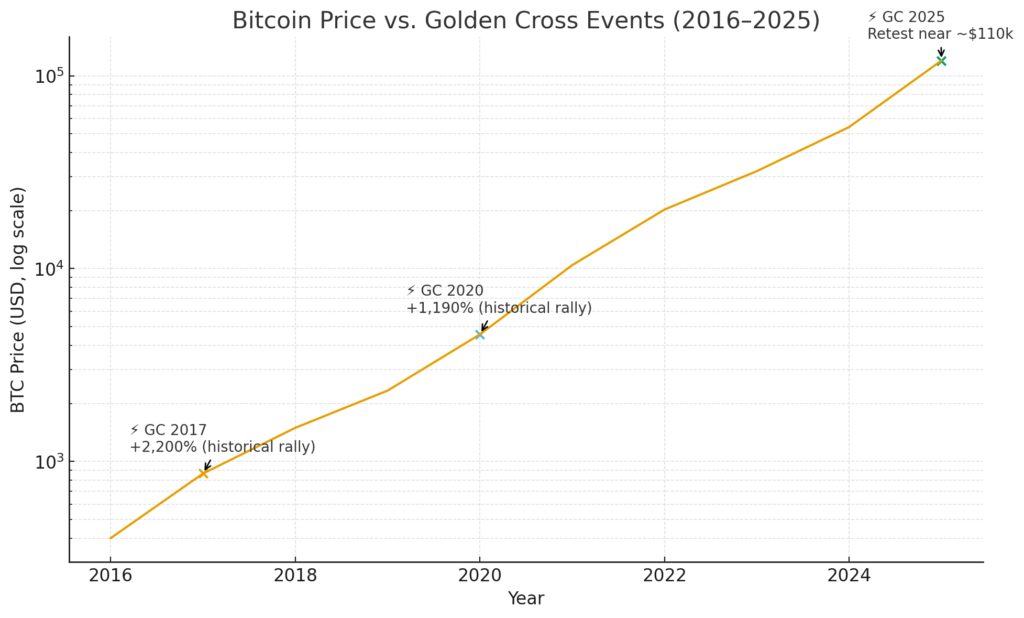 In October 2025, Bitcoin is reportedly retesting that setup. If the price can hold above the key level (near $110,000) and confirm the cross, many view this as setting the stage for a possible structural bull run.