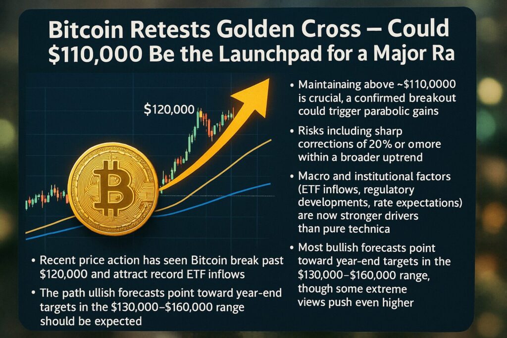 Bitcoin’s retest of the golden cross in 2025 is one of the most talked-about technical setups in crypto today. If the price holds above ~$110,000 and confirms the cross, it may act as a springboard for a sustained rally. At the same time, macro shifts, institutional adoption, and regulatory developments are increasingly powerful determinants of direction.