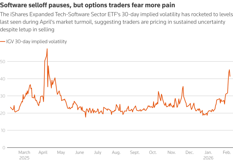 - The decline coincided with a continued sell-off in U.S. software stocks, particularly those tracked by the iShares Expanded Tech-Software Sector ETF (IGV), which is down roughly 32% since October.