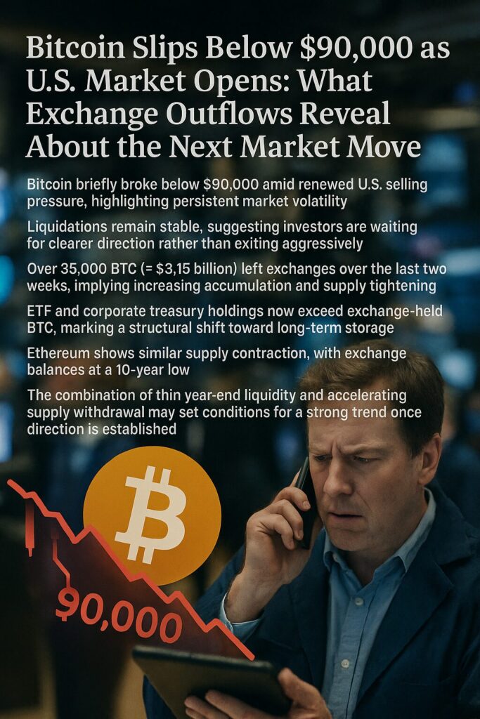 Bitcoin’s brief slip below $90,000 reflects surface-level volatility, but beneath the price action lies a deeper structural transformation: supply is tightening at a pace not seen in years. Exchanges are losing BTC to long-term holders, ETFs, and corporate treasuries. Ethereum is experiencing parallel contraction. Investors remain cautious but engaged, and liquidations are controlled.