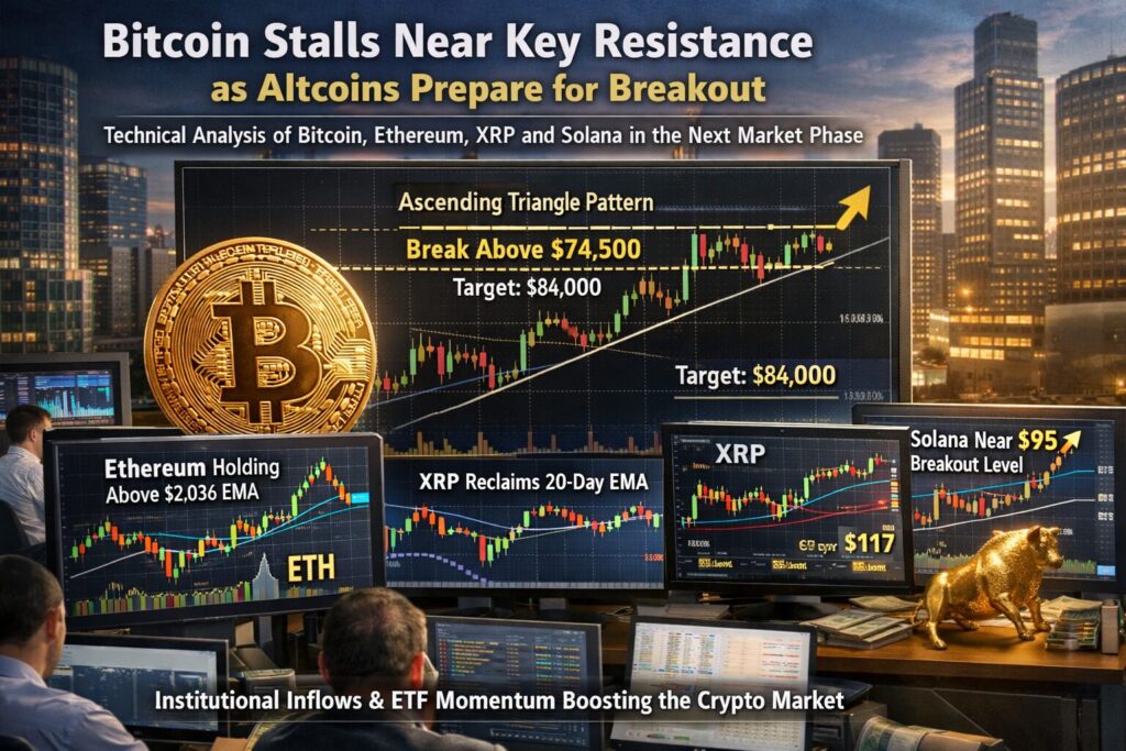 The cryptocurrency market is once again approaching a critical moment. After a strong rally earlier this year, Bitcoin has begun to slow its upward momentum near a major resistance zone around $74,500. This hesitation is not necessarily a sign of weakness. In many cases, such consolidation phases serve as a launchpad for the next major price movement, particularly when supported by strong technical indicators and improving macroeconomic sentiment.