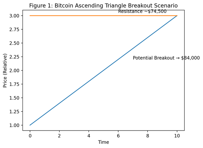 If Bitcoin successfully breaks above the $74,508 resistance, it would complete a bullish ascending triangle pattern, one of the most widely recognized continuation patterns in technical analysis.