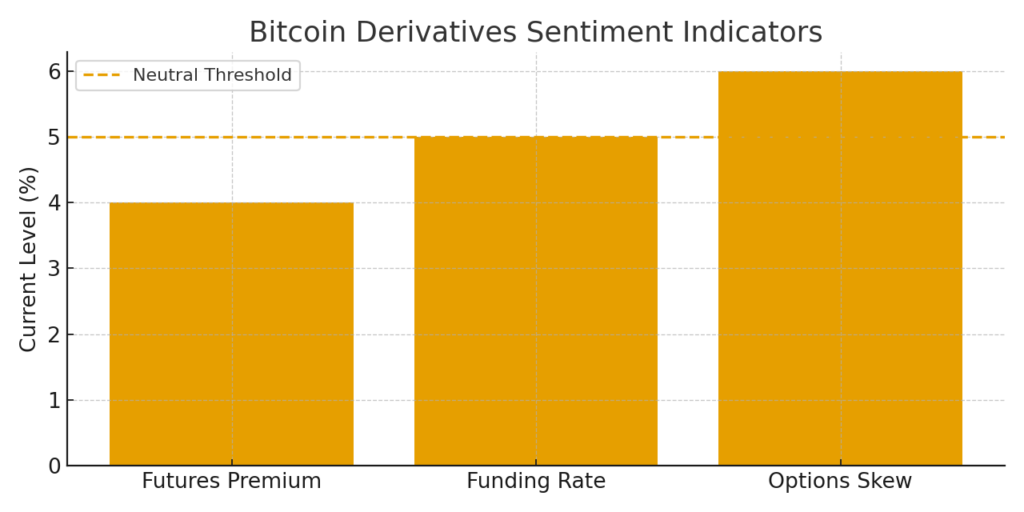 - The monthly futures premium for Bitcoin has fallen below the “neutral” threshold of ~5 % above spot; some reports place it at ~4 %.