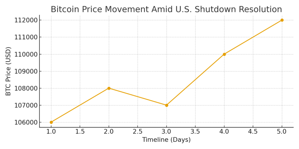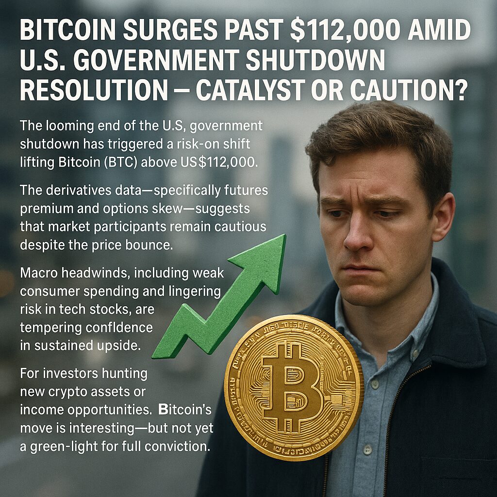 The recent price jump of Bitcoin beyond US$112,000 is linked in part to the advancing resolution of the U.S. federal government shutdown. With the U.S. Senate advancing a funding bill, risk‐assets including crypto have seen improved sentiment.
