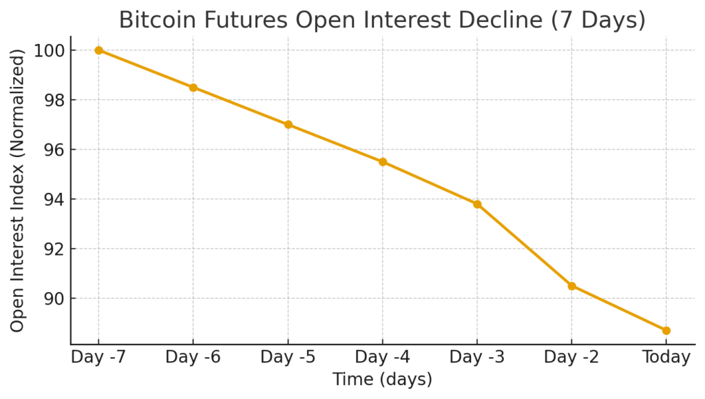 The derivatives markets are showing a clear drop in interest: for example, the on-chain analytics platform CryptoQuant reports more than an 11 % decline in open interest (OI) over the past week.