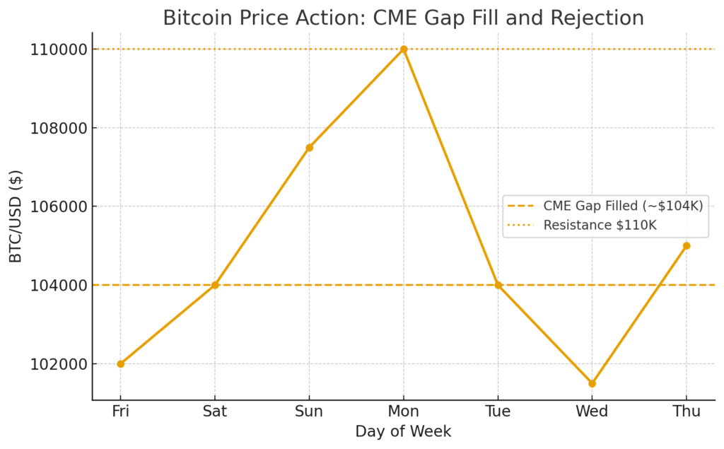 - The flagship crypto Bitcoin (BTC) filled the entity[“organization”, “CME Group”, 0] futures “gap” around $104,000, yet failed to rally through $110,000 due to large-scale selling.