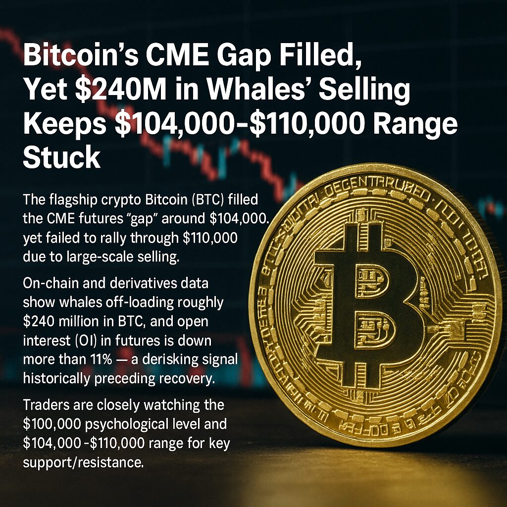 In summary: While Bitcoin’s CME futures gap around $104,000-$110,000 has been filled—technically a bullish sign—the market structure isn’t confirming an immediate breakout. Whale selling of ~$240 million has weighed on momentum, and open interest’s >11% drop signals reduced speculative levered exposure. Support around $100,000 is now critical, and the ceiling near $110,000 remains a barrier for now.