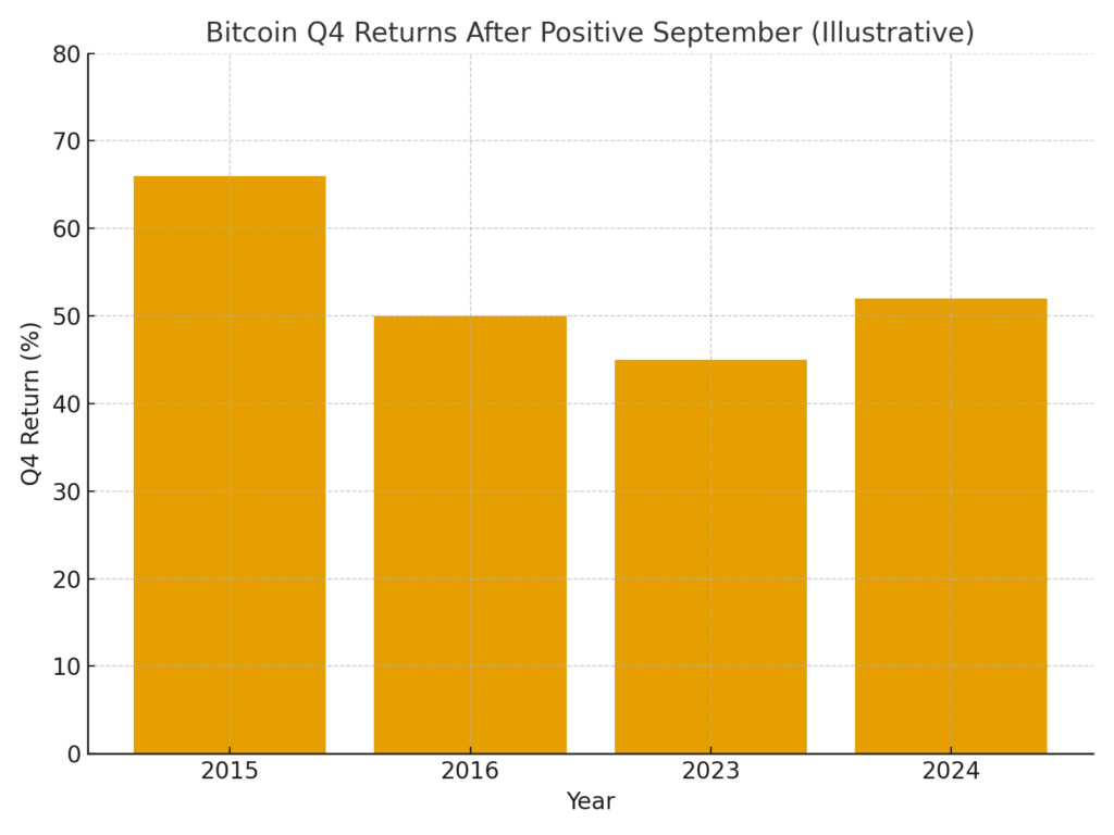 Bitcoin’s approximately 4.5 % rise in September, closing near $113,100, stands out because historically, September is often a weak or neutral month. That said, in years when September ended green, Bitcoin has often enjoyed a powerful fourth quarter. In 2015, 2016, 2023, and 2024, Q4 returns ranged between 45 % and 66 %. The distribution of returns over Q4 in those years shows that October tends to deliver the strongest monthly gain (e.g. ~21.8 % average), followed by moderate strength in November, and mixed results in December.