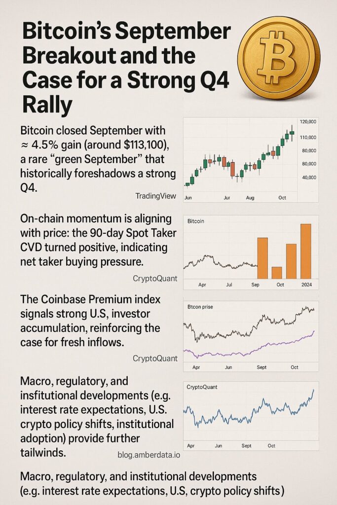 • Bitcoin closed September with a ≈ 4.5 % gain (around $113,100), a rare “green September” that historically foreshadows a strong Q4.