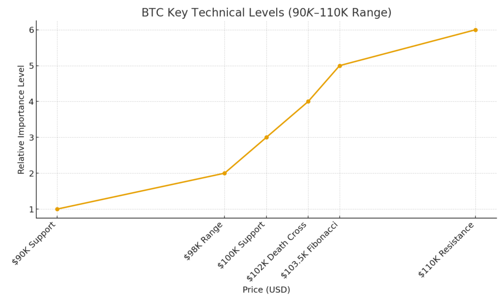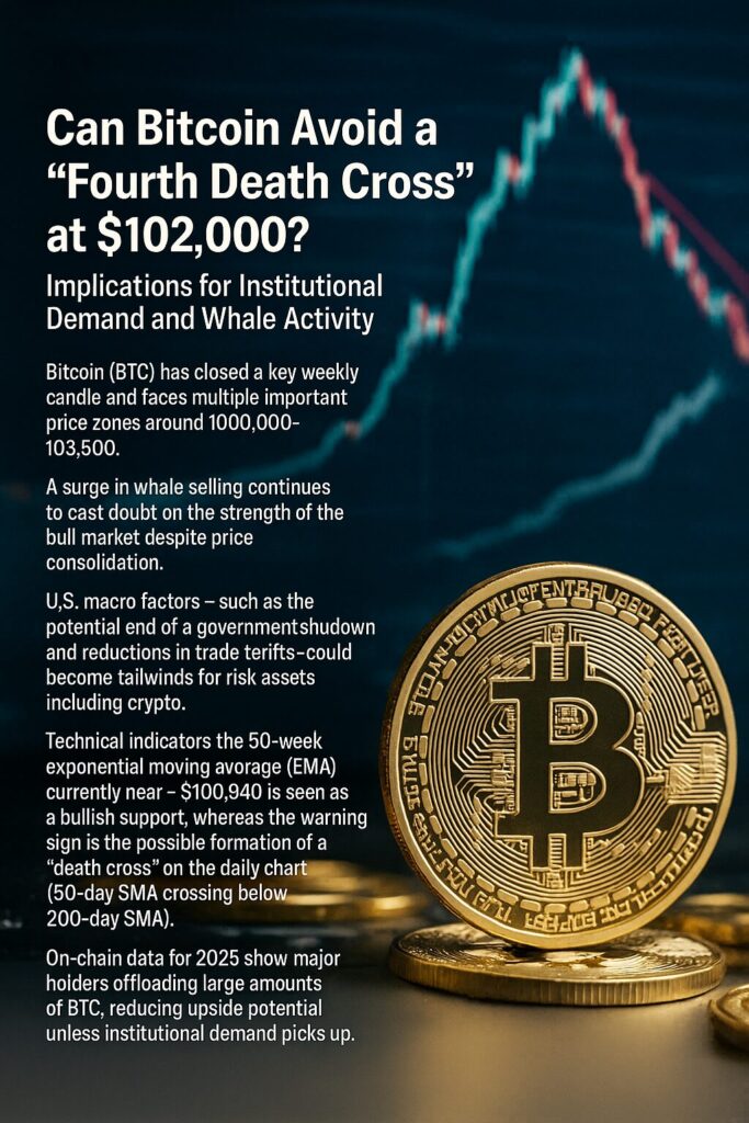 - Technical indicators: the 50-week exponential moving average (EMA) currently near ~$100,940 is seen as a bullish support, whereas the warning sign is the possible formation of a “death cross” on the daily chart (50-day SMA crossing below 200-day SMA).