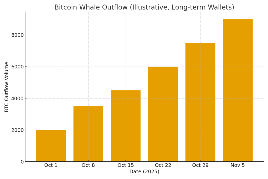 *(Insert chart showing whale outflows and holder cohorts here: “Figure 3: On-chain flows – large holder net selling vs smaller holder accumulation”) *