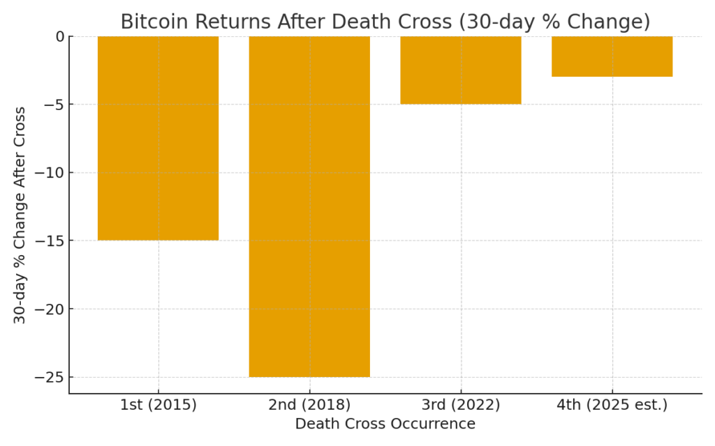 Beyond the weekly picture, technical watchers are focused on the potential formation of a so-called “death cross” on the daily chart of Bitcoin. A death cross occurs when a short-term moving average (such as the 50-day SMA) crosses below a longer-term moving average (such as the 200-day SMA), traditionally signalling trend weakness.