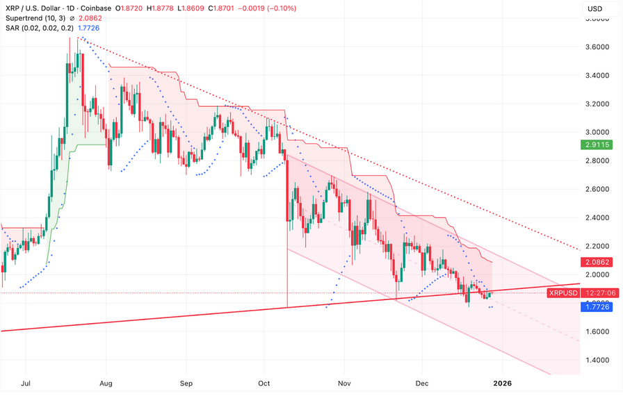 XRP remains entrenched in a descending channel, reflecting persistent selling pressure and limited speculative interest compared to other large-cap crypto assets.