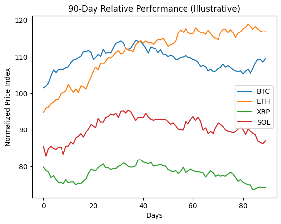 A comparison chart showing BTC, ETH, XRP, and SOL performance over the past 90 days.