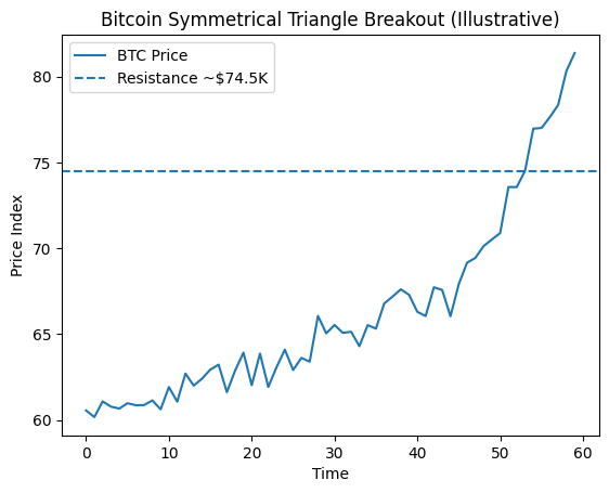 BTC chart highlighting the symmetrical triangle breakout and key resistance levels.