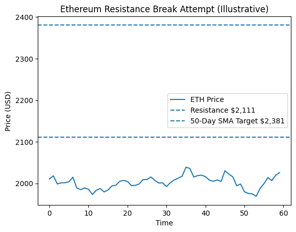 ETH chart showing the $2,111 resistance and the 50-day SMA target.