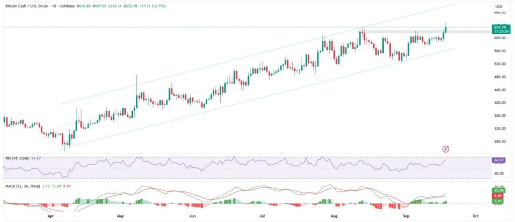 If the rebound continues, bulls may attempt another push toward $651 and $720. Conversely, a break below the 20-day EMA would suggest profit-taking, potentially dragging BCH toward the 50-day SMA near $538.