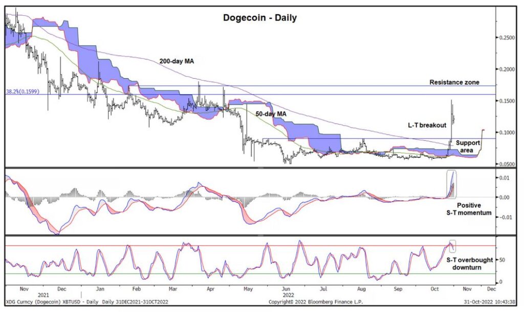 [Dogecoin daily chart with range boundaries and moving averages]