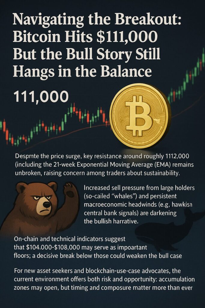 Bitcoin’s climb to about $111,000 is both encouraging and cautionary. The price move signals renewed interest, but without breaking and holding key resistance (especially ~$112,000 and the 21-week EMA) the risk of a false breakout remains meaningful. Macro factors — whale behaviour, ETF flows, central-bank policy — are playing a heavier role than many appreciate.