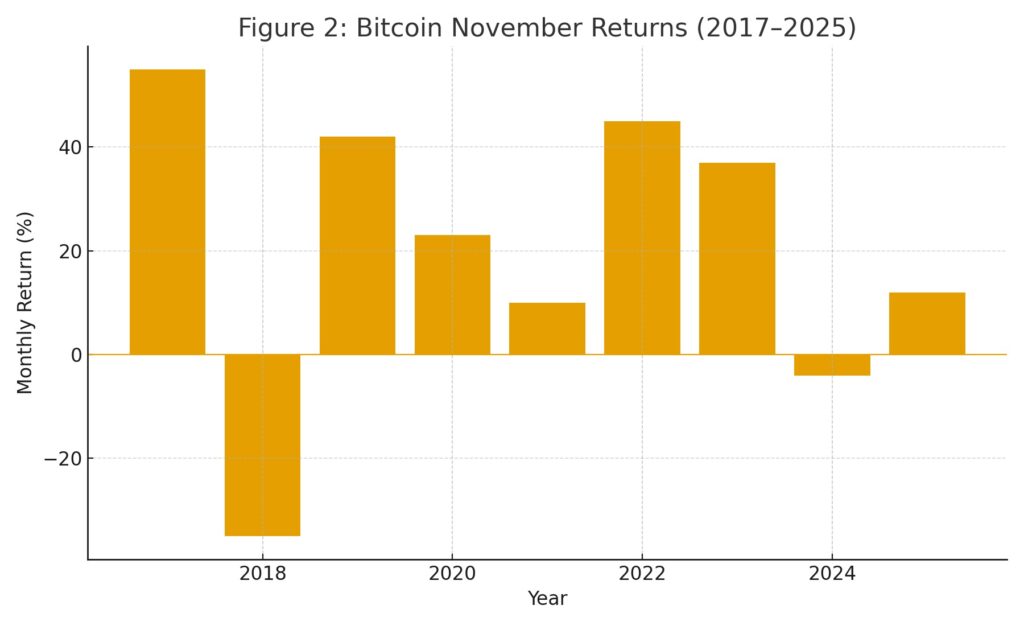 October was notably weak for Bitcoin (down ~4 %), marking the first monthly decline since 2018 for the “Uptober” month. Furthermore, historical patterns suggest November can be strong for Bitcoin (average gain ~42 %) — but the setup this year is more nuanced given liquidations (~$19 billion in long positions) and tight liquidity.
