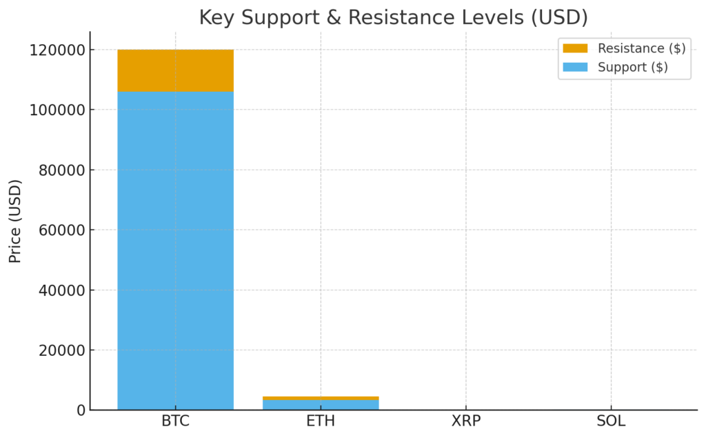 - The major cryptocurrencies Bitcoin (BTC), Ethereum (ETH), XRP and Solana (SOL) are showing both bullish and bearish technical setups, with key support/resistance zones in play.