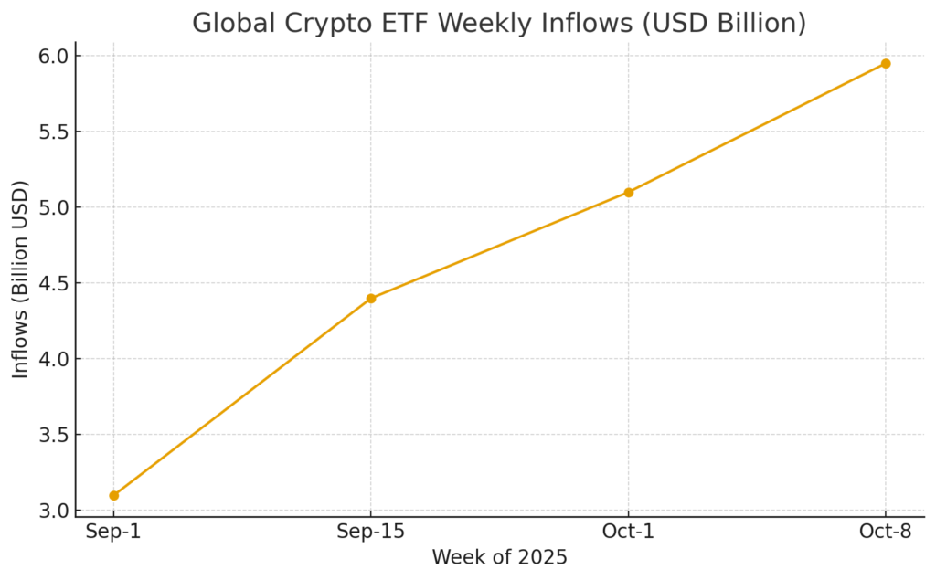 The “big money” is flowing into crypto via ETFs and institutional products. Globally, crypto ETFs recorded record inflows of US$ 5.95 billion in the week ending October 4 2025, led by US investors (~US$5 billion) and with BTC, ETH, SOL and XRP capturing significant portions.