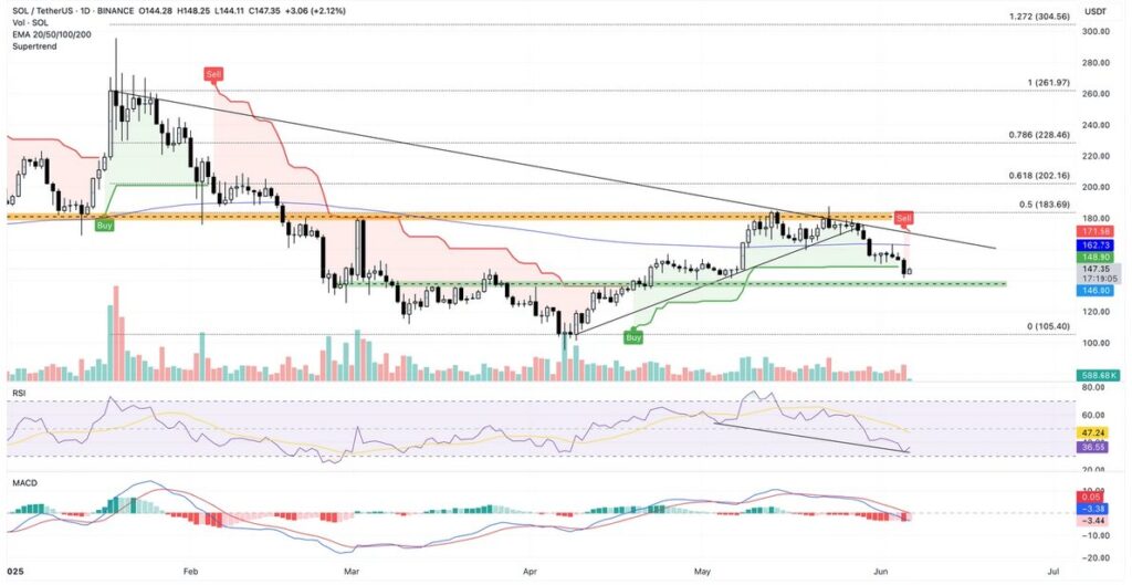 [Solana daily chart with 20-day EMA, support at $116 and $95]
