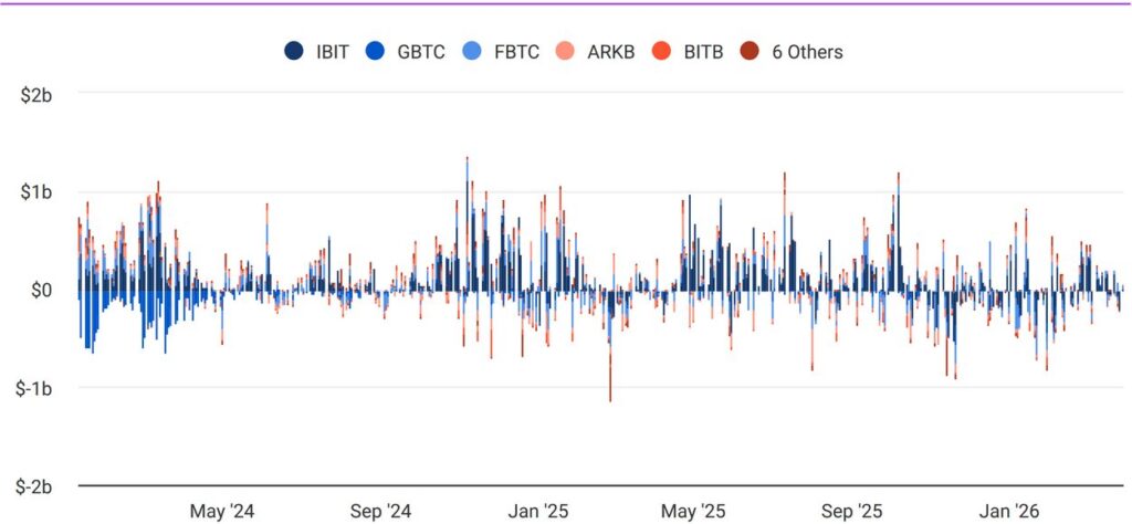 Bitcoin ETFs—particularly those issued by BlackRock and legacy products like Grayscale—show a pattern of rotation rather than net inflow.