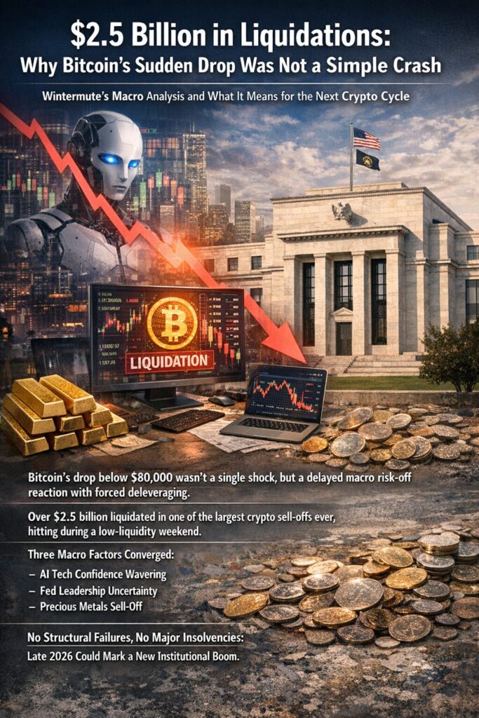According to leading crypto market maker Wintermute, this was not a panic-driven collapse caused by a single headline. Instead, it was the result of a “delayed risk-off” process, where multiple macroeconomic stressors accumulated quietly before detonating through leverage.