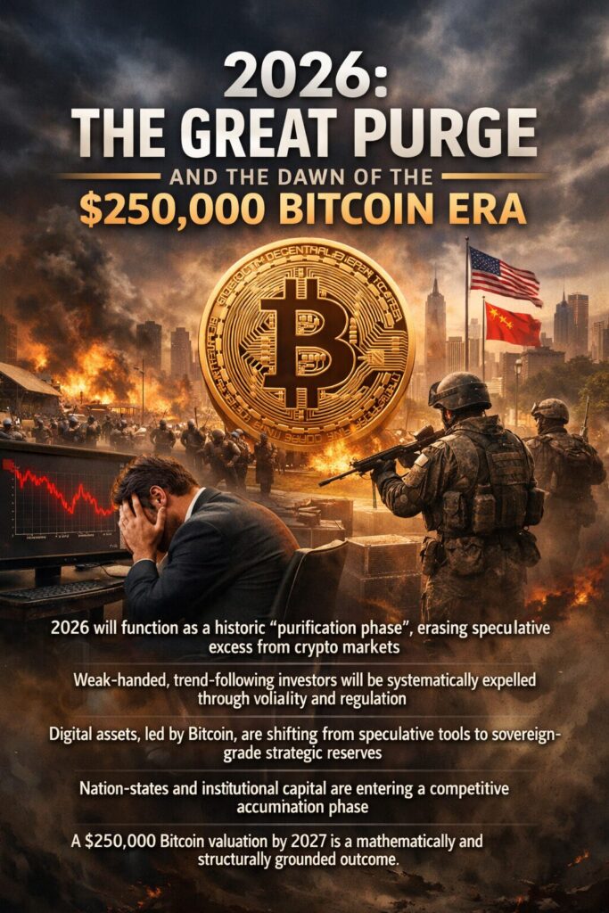 - 2026 will function as a historic “purification phase,” erasing speculative excess from crypto markets