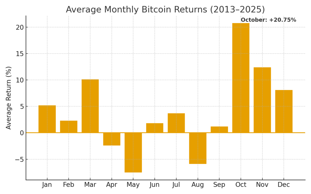 • Historically, October has produced an average gain of ~20.75 % for Bitcoin; a move from ~$116,500 to $140,000 would represent ~20 % growth
