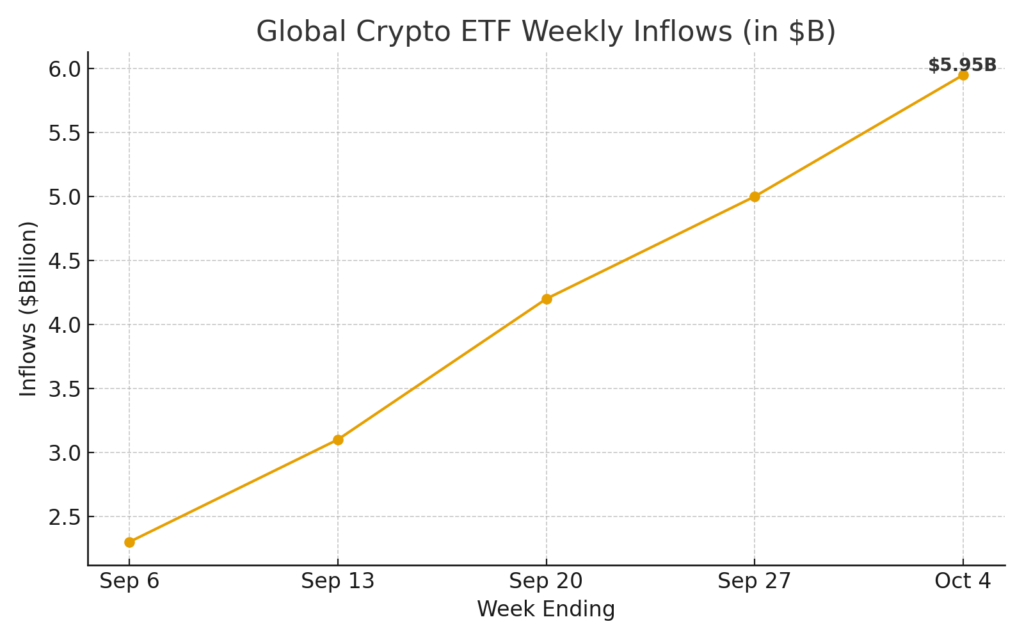 In the week ending October 4, 2025, global crypto ETFs saw record inflows of $5.95 billion, led by U.S. funds (~$5B), with Bitcoin attracting $3.55B and Ether $1.48B. These inflows provide structural demand and deepen liquidity in crypto assets.