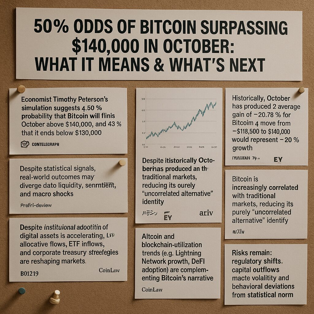 Timothy Peterson’s forecast of a 50 % probability for Bitcoin to exceed $140,000 in October draws attention — especially since it aligns with historical October returns and uses structured simulations rather than gut calls. But this is not a guarantee: real-world markets are messy and governed by capital flows, emotion, regulation, and macro conditions.