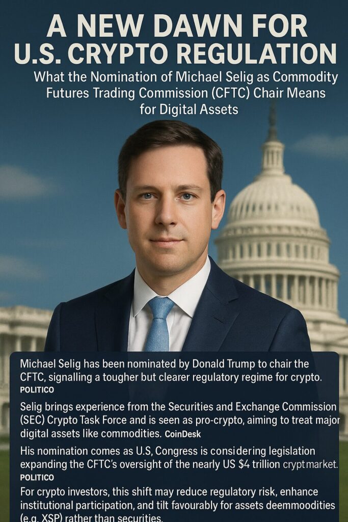 The nomination of Michael Selig as chair of the CFTC represents a meaningful pivot point in U.S. crypto regulation. For token issuers, blockchain developers, and investors alike, this development offers a clearer horizon: a regulatory framework that is more harmonised, more predictable, and more supportive of innovation — while still anchored in oversight.