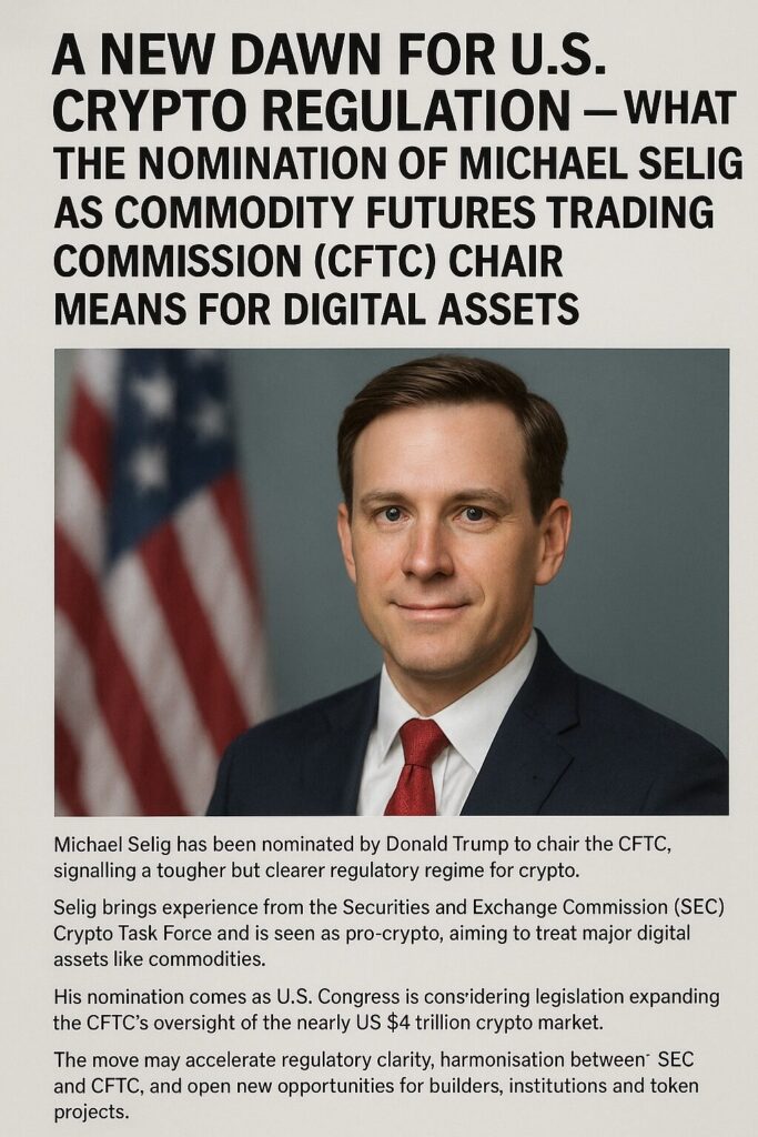 The nomination of Michael Selig as chair of the CFTC represents a meaningful pivot point in U.S. crypto regulation. For token issuers, blockchain developers, and investors alike, this development offers a clearer horizon: a regulatory framework that is more harmonised, more predictable, and more supportive of innovation — while still anchored in oversight.