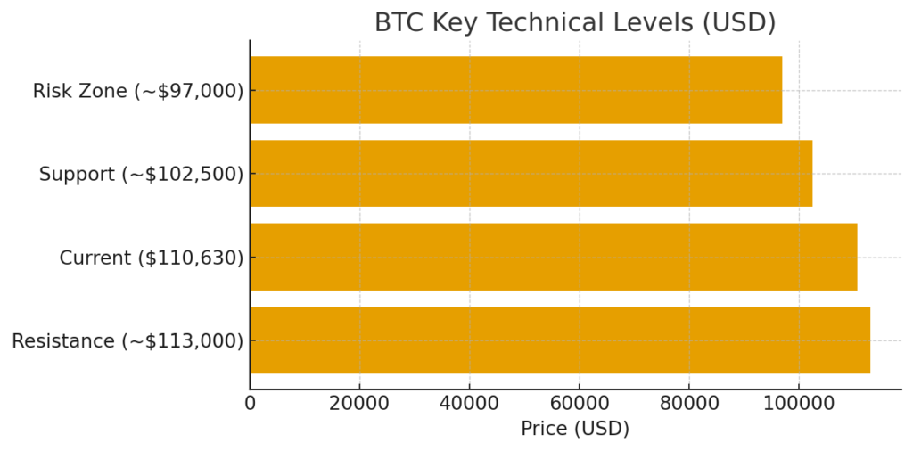 • A resistance at approximately $113,000 continues to cap upside; key support resides near ~$102,500 (50-week MA), with a downside risk toward ~$97,000 if momentum fades.